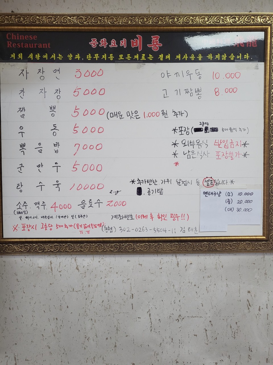 '중화요리비룡'에는 유니짜장면 외에도 다양한 메뉴가 준비되어 있습니다. 특히 우동은 5,000원이라는 착한 가격에 푸짐한 양을 자랑하며, 시원하고 깊은 국물 맛이 일품입니다. 탱글탱글한 면발과 신선한 해산물이 어우러져 든든한 한 끼 식사를 책임집니다. 또한, 5,000원 간짜장, 5,000원 짬뽕도 인기 메뉴 중 하나입니다. 갓 볶아낸 신선한 재료와 불맛이 살아있는 간짜장 소스는 짜장면과는 또 다른 매력을 선사합니다. 얼큰하고 시원한 짬뽕은 해장으로도 좋습니다. 10,000원 탕수육은 바삭한 튀김옷과 새콤달콤한 소스의 조화가 일품입니다.