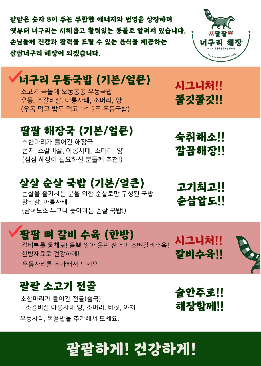 생생정보 우동국밥 맛집 팔팔너구리해장 신당본점은 진한 육수와 푸짐한 재료로 승부하는 곳이에요. 너구리 우동국밥(얼큰)은 얼큰한 국물에 소고기의 깊은 맛이 더해져 숙취 해소는 물론 입맛을 돋우기에 딱 맞아요. 기본 버전은 담백하면서도 육향이 강해 시그니처라는 이름이 납득될 거예요. 뼈갈비수육은 한방 재료로 건강함을 더했고, 팔팔 소고기 전골은 다양한 소고기 부위가 어우러져 깔끔한 맛을 자랑해요. 냉큼아롱수육은 폰즈 소스의 상큼함으로 색다른 매력을 줘요. 기다림 끝에 나오는 맛이 특별할 것 같네요.