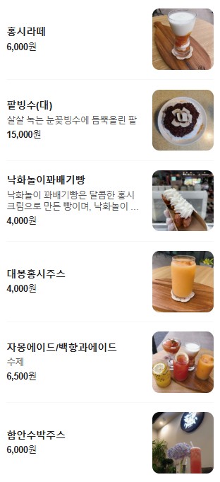 또 다른 디저트로는 홍시아이스크림(6,000원)이 있는데, 얼린 홍시와 아이스크림의 조화가 색다른 맛을 선사한다고 합니다. 이 외에도 팥빙수(대) (15,000원), 자몽에이드/백향과에이드(6,500원) 등 다양한 선택지가 있어, 빵과 함께 곁들이기 좋아요.