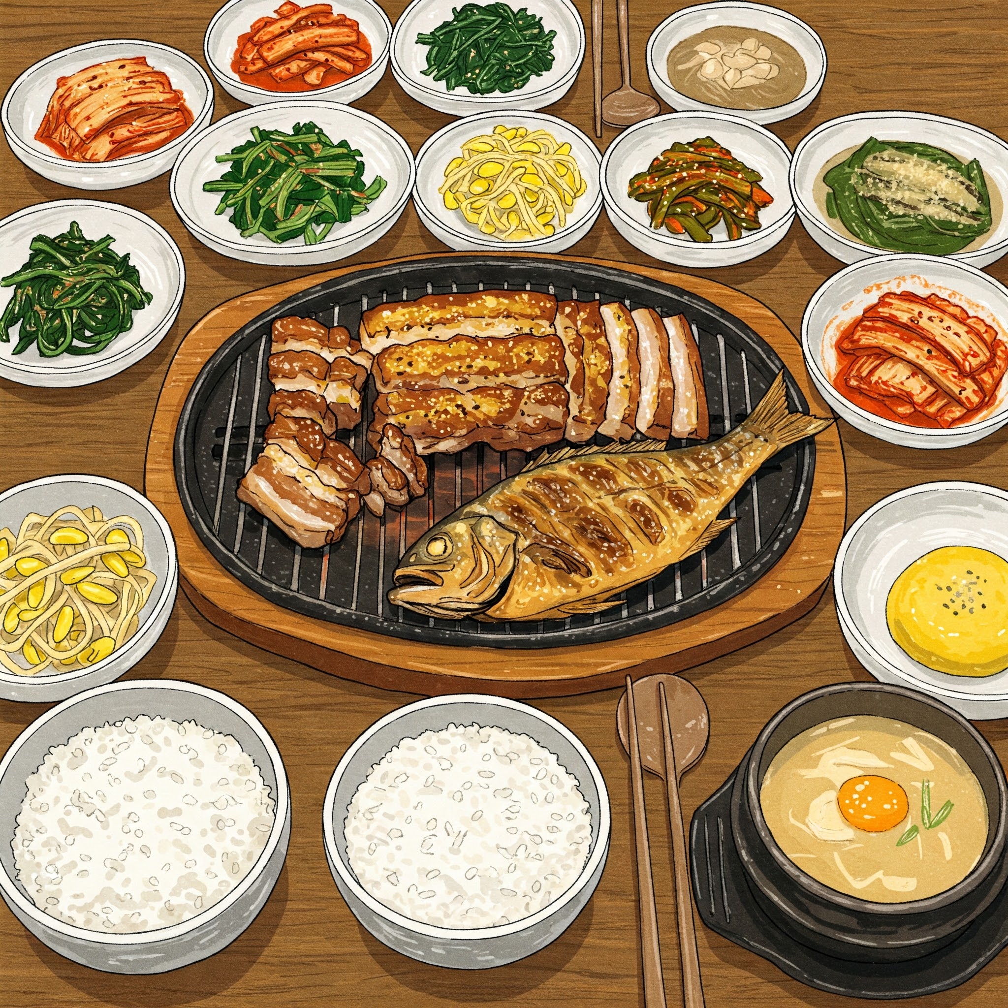 생생정보 머릿고기 백반의 가장 큰 매력은 바로 반찬의 다양성과 푸짐함입니다. 삼겹살 백반을 주문하시면 기본적으로 14가지 이상의 반찬이 테이블을 가득 채웁니다. 반찬은 계절과 날에 따라 달라진다고 하며, 대표적으로 양념게장, 꼬막무침, 굴무침, 가자미구이, 고등어구이, 시레기된장국, 나물무침, 감자조림 등이 포함됩니다. 생생정보 삼겹살 백반 맛집 과역기사님식당의 반찬은 고흥의 신선한 해산물과 농산물을 활용하여 정갈하고 깊은 맛을 자랑합니다. 특히 양념게장은 매콤하면서도 짭짤한 맛이 밥과 잘 어울리며, 가자미구이는 양념장과 함께 제공되어 별미로 꼽힙니다. 반찬 하나하나가 정성스럽게 준비되어, 삼겹살 없이도 밥 한 공기를 뚝딱 비우실 수 있을 정도입니다. 생생정보 머릿고기 백반은 반찬의 양과 질 덕분에 ‘밥도둑’이라는 별명을 얻었습니다.