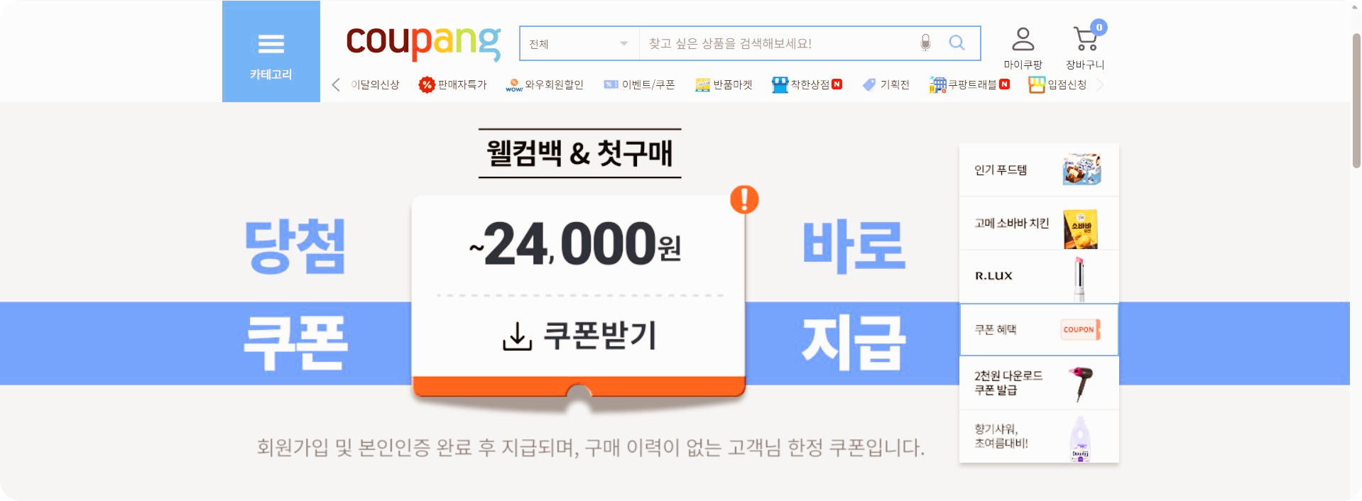 쿠팡 웰컴백 쿠폰을 받으시는 방법은 매우 간단합니다. 아래 단계를 따라 주세요.
