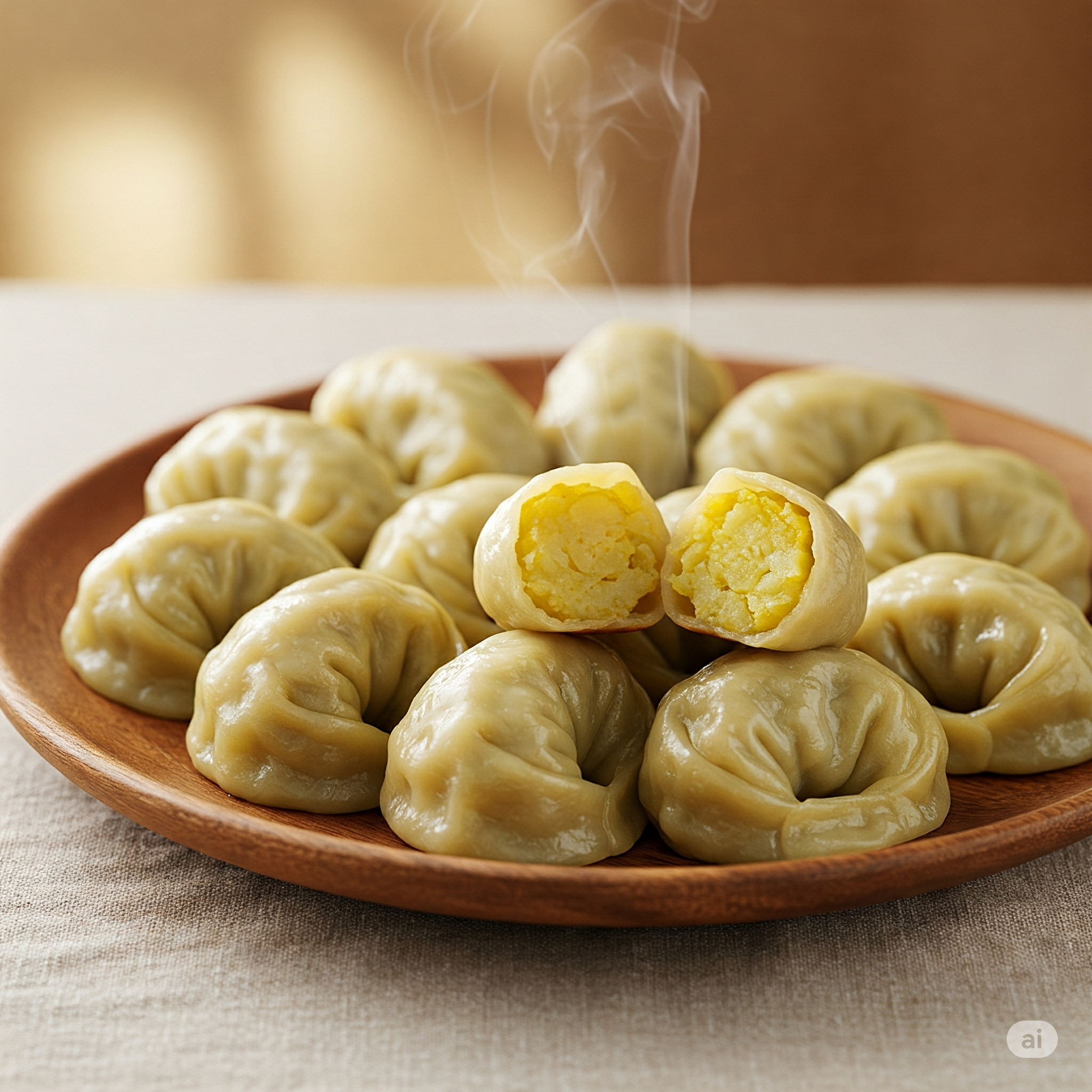 - 감자만두 10개(6,000원): 고기만두 5개, 김치만두 5개로 구성된 푸짐한 한 접시.