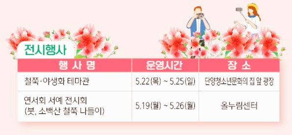 3) 레이저쇼·불꽃놀이 (5월 23일, 25일): 양백산을 배경으로 700m 규모의 멀티미디어 레이저쇼와 불꽃놀이가 단양의 밤을 화려하게 수놓습니다. 소백산 철쭉 제 개화상황을 형상화한 공연은 잊지 못할 감동을 선사합니다.