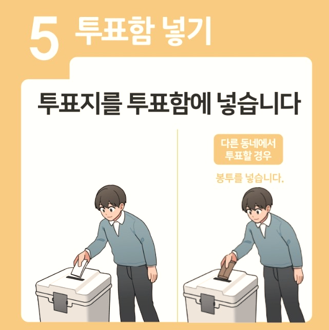 밀봉한 회송용 봉투를 투표함에 넣으면 투표가 완료됩니다. 투표소 직원의 안내를 따라 투표함에 봉투를 투입하세요.