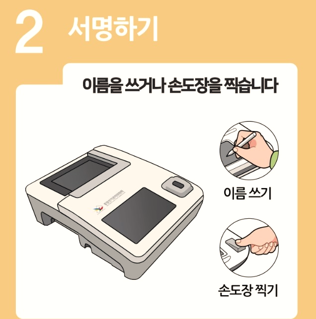 투표소 직원이 신분증을 확인한 후, 본인 확인기(전자 장치)에 손도장을 찍거나 서명을 합니다. 이 과정에서 관내·관외 선거인 여부가 구분됩니다.