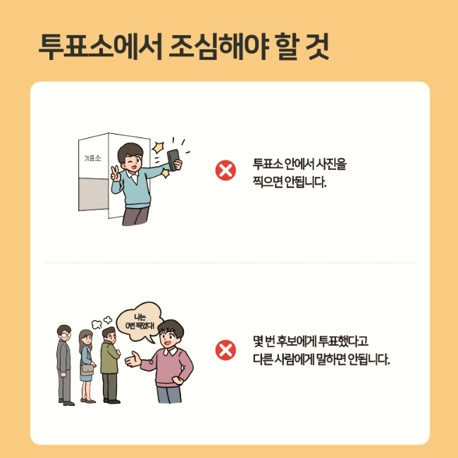 1) 투표소 내 촬영 금지: 투표소 내부나 투표용지 촬영은 불법입니다. 투표소 입구 표지판 앞에서 인증샷을 찍는 것은 가능합니다.